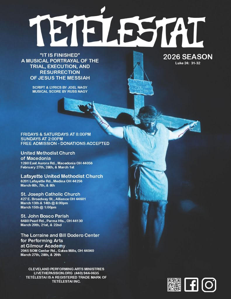 Produced by Cleveland Performing Arts Ministries, Tetelestai features script and lyrics by Joel Nagy with musical score by Russ Nagy. The 2026 season is based on Luke 24:31–32 and will be presented across multiple churches in Northeast Ohio.