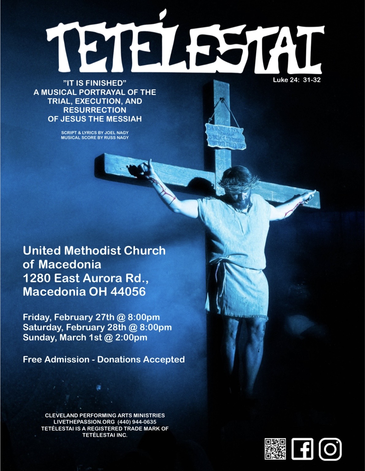 Starting Friday, February 27, the church will host “Tetélestai,” a musical portrayal of the trial, execution, and resurrection of Jesus the Messiah. Presented by Cleveland Performing Arts Ministries, the production features a script and lyrics by Joel Nagy with a musical score by Russ Nagy. Performances are scheduled for Friday, February 27, and Saturday, February 28, at 8:00 p.m., with a final matinee on Sunday, March 1, at 2:00 p.m. Admission is free, though donations are accepted.