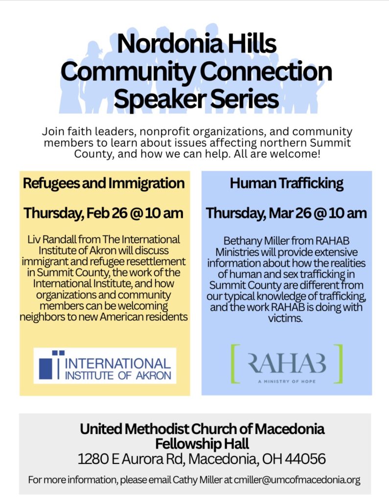 The first immediate event in the Speaker Series takes place tomorrow, Thursday, February 26, at 10:00 a.m. Liv Randall from The International Institute of Akron will visit the Fellowship Hall to discuss immigrant and refugee resettlement in Summit County. The session aims to educate community members on how to be welcoming neighbors to new American residents and understand the work of the International Institute.