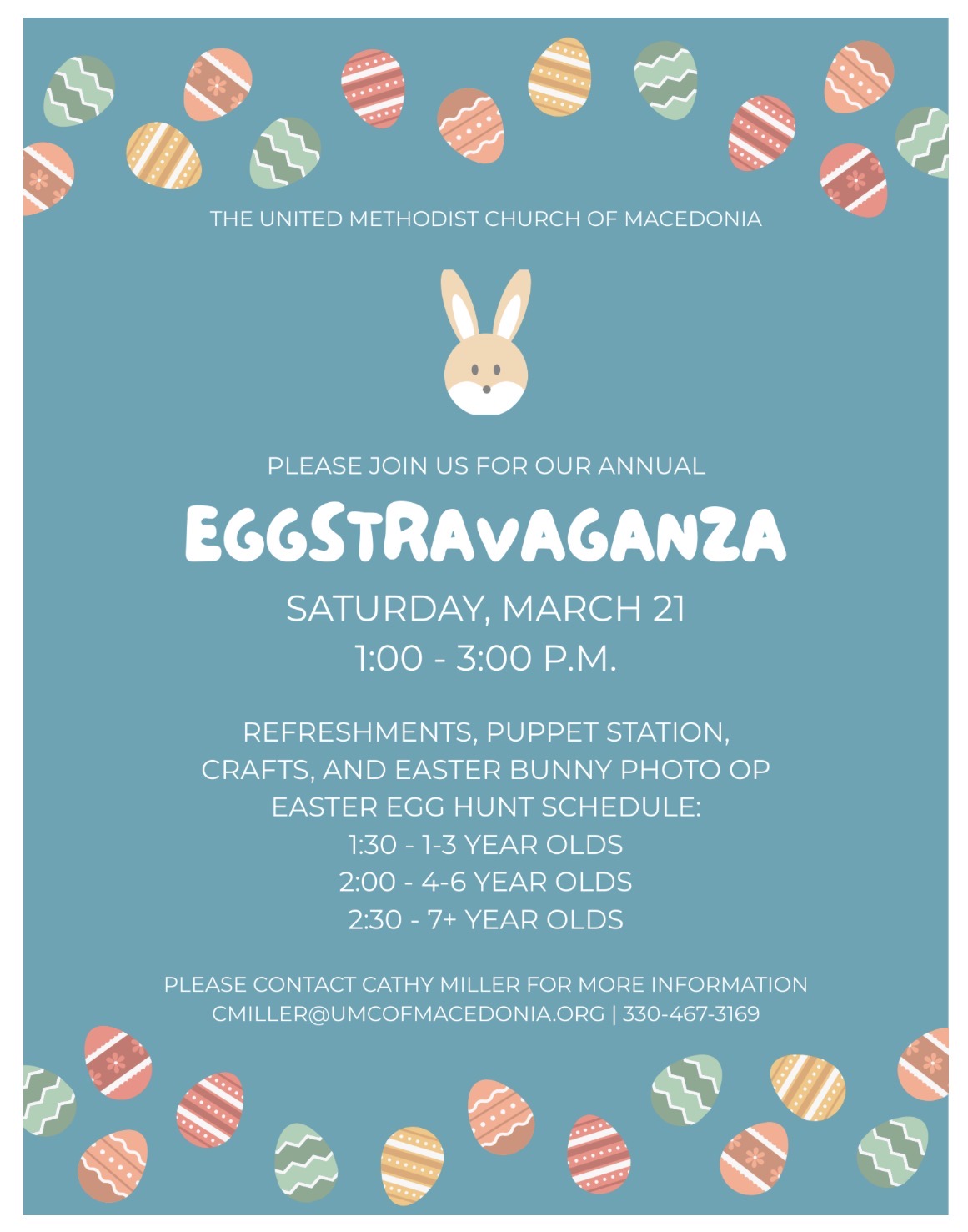 On Saturday, March 21, the church will host its annual Eggstravaganza from 1:00 to 3:00 p.m. This family-friendly afternoon includes refreshments, a puppet station, crafts, and photos with the Easter Bunny. The Easter egg hunt schedule is staggered by age: 1-3 year olds at 1:30 p.m., 4-6 year olds at 2:00 p.m., and children aged 7 and older at 2:30 p.m.