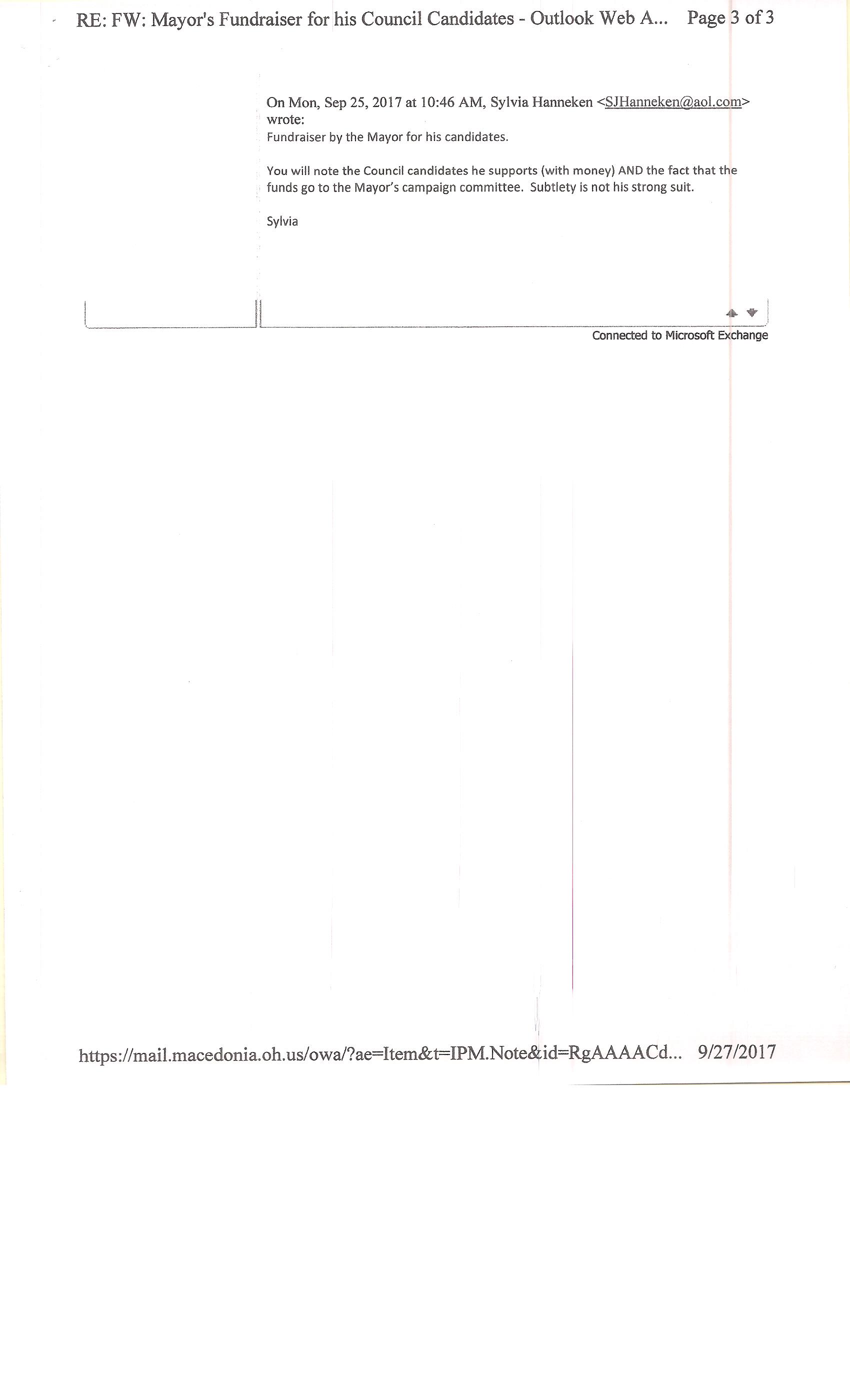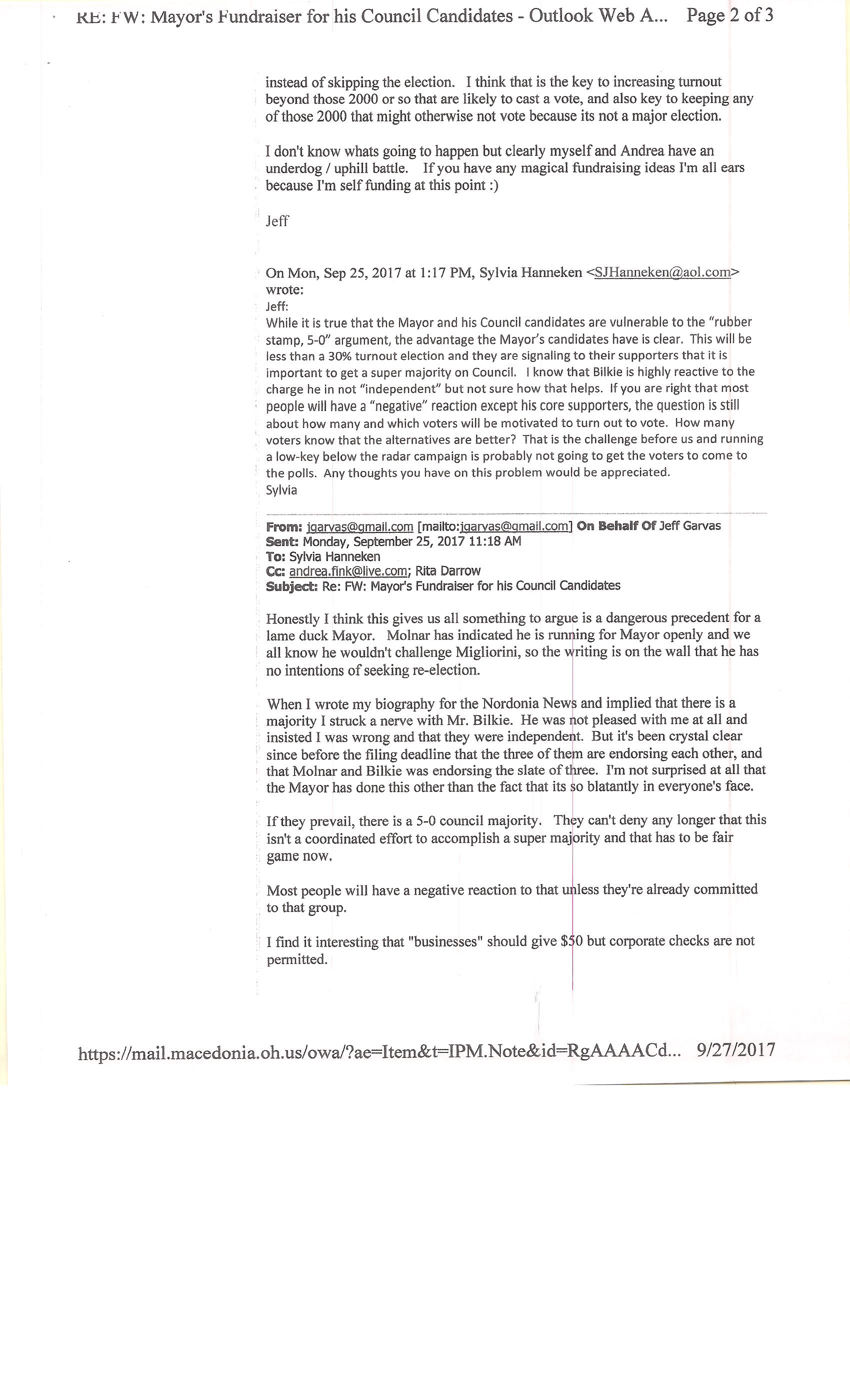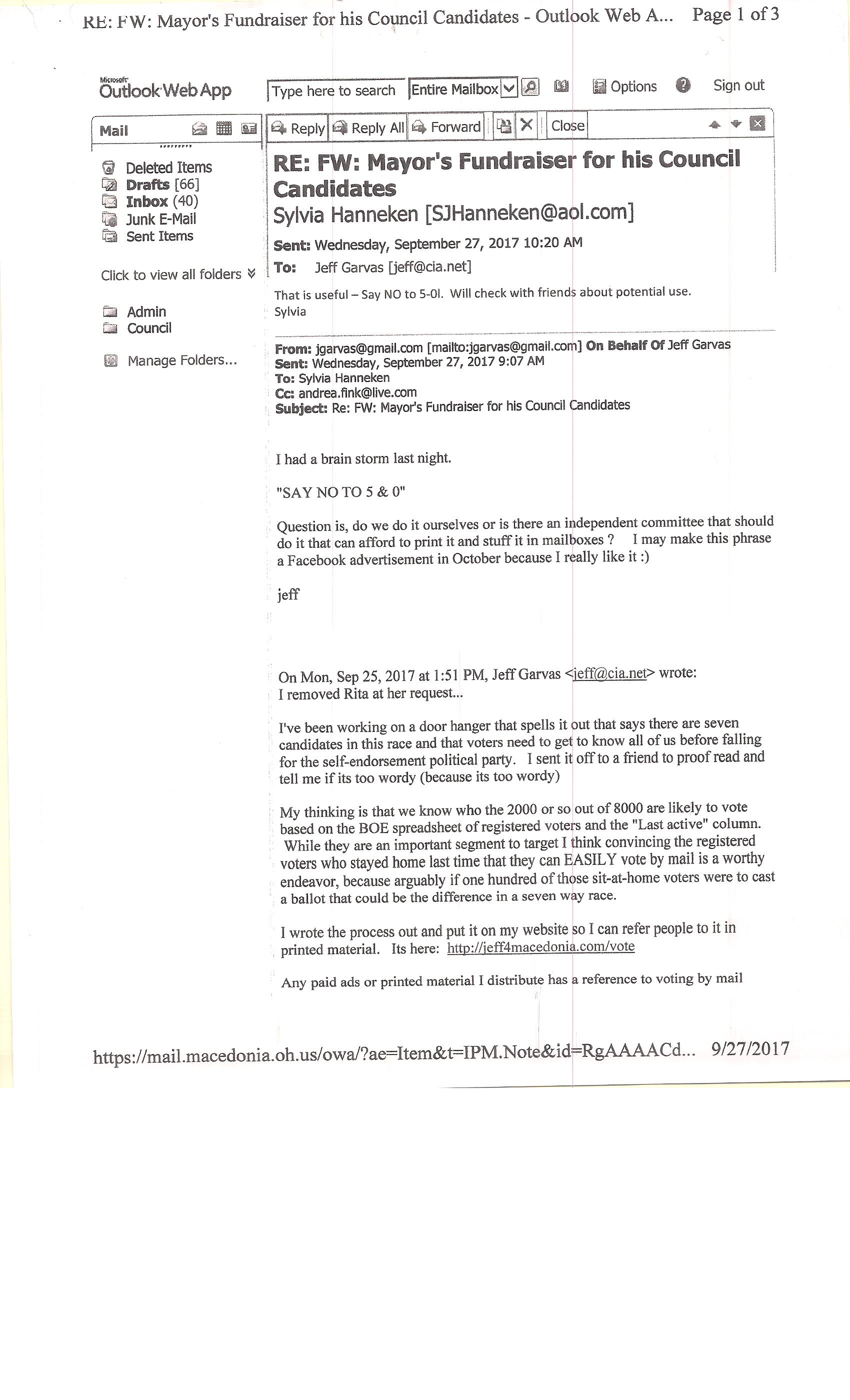 I reached out to Jeff Garvas and the other new candidates some time back to find out their stance on where Macedonia stands. In that conversation, I told Jeff that I would work with him if he won and expressed my displeasure with Mrs. Hanneken which was evident by her two censures and recent racist comments. We ended the conversation on a high note of which I wished him well. Fast forward to today when Mr. Garvas decided to make a cartoon claiming he wanted to be “an independent swing vote to collaborate.” He also states “my interests are for an independent council.” He concludes the video with “All three of them must be defeated.” I am not up for election and I have no ill will toward the candidate, yet he decided to throw my name into the mix. I normally would ignore this type of banter, but to suggest impropriety is unfair and demands a response. Mr. Garvas is an intelligent man but has failed to focus on why he is running and the issues we face. You have to question his motives when he finger points in all his ads and does not focus on storm water, roads, finances or safety forces. I made a public record request in order to obtain some information but the request turned up an alarming “collaboration” which speaks for itself. Please look over the names and substance that are in the public record e-mail and decide if Mr. Garvas will be that “independent swing vote.” – See three pages attached below the article.