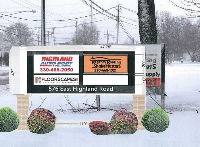 The final item on the agenda involved a request from Sagamore Development to replace aging signage at 576 E. Highland Road with a single, cohesive multi-tenant monument sign. The proposal aims to eliminate two existing ground signs in favor of one 38.85-square-foot structure.