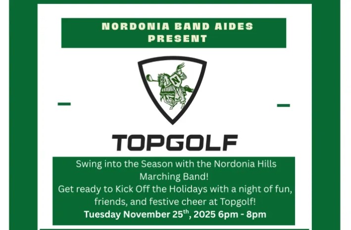 The Nordonia Band Aides are inviting families, friends and supporters to kick off the holiday season with a Topgolf Family Fun Event on Tuesday, November 25, 2025, from 6–8 p.m. at Topgolf, 600 Swartz Rd., Akron, OH 44319.