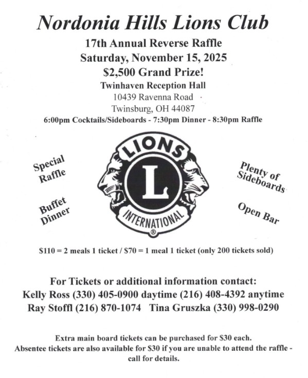 The Nordonia Hills Lions Club will hold its annual reverse raffle fundraiser on Nov. 15 at Twinhaven Reception Hall in Twinsburg. The event features a $2,500 grand prize, buffet dinner, open bar and sideboards.